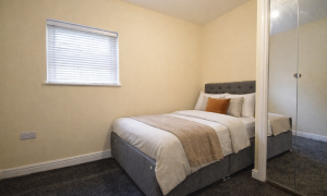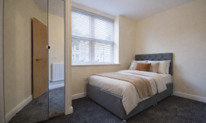 The main living and sleeping area is spacious and filled with natural light from large double windows. It is furnished with a luxury upholstered bed and benefits from built-in mirrored wardrobes, offering excellent storage while keeping the room feeling open and uncluttered. The neutral décor and soft grey carpeting create a calm and modern atmosphere throughout.