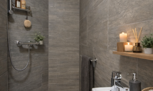 The bathroom is finished in a sleek, contemporary style with full-height grey tiling, a walk-in rainfall shower, chrome fittings and a modern vanity sink, giving it a clean, hotel-style feel.