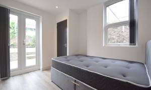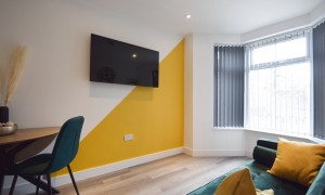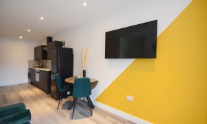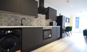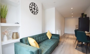 This stunning 2-bedroom ground-floor apartment offers modern living with stylish finishes throughout. Each double bedroom comes with built-in wardrobes and beds with comfortable mattresses. The open-plan kitchen is sleek and fully equipped with integrated appliances, including a washer/dryer, hob/oven, microwave, and fridge freezer, all set behind elegant push-to-open unit doors. The spacious lounge area is perfect for relaxing, featuring a wall-mounted TV and a luxurious green velvet sofa that complements the dining chairs. Additionally, the apartment benefits from a large concrete garden space, ideal for outdoor entertaining or relaxation. This is a perfect blend of comfort, convenience, and modern design.